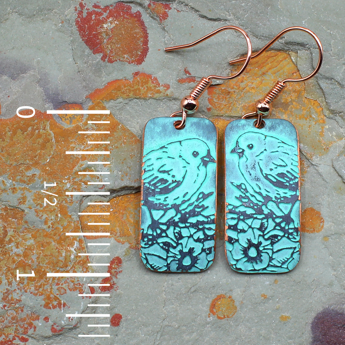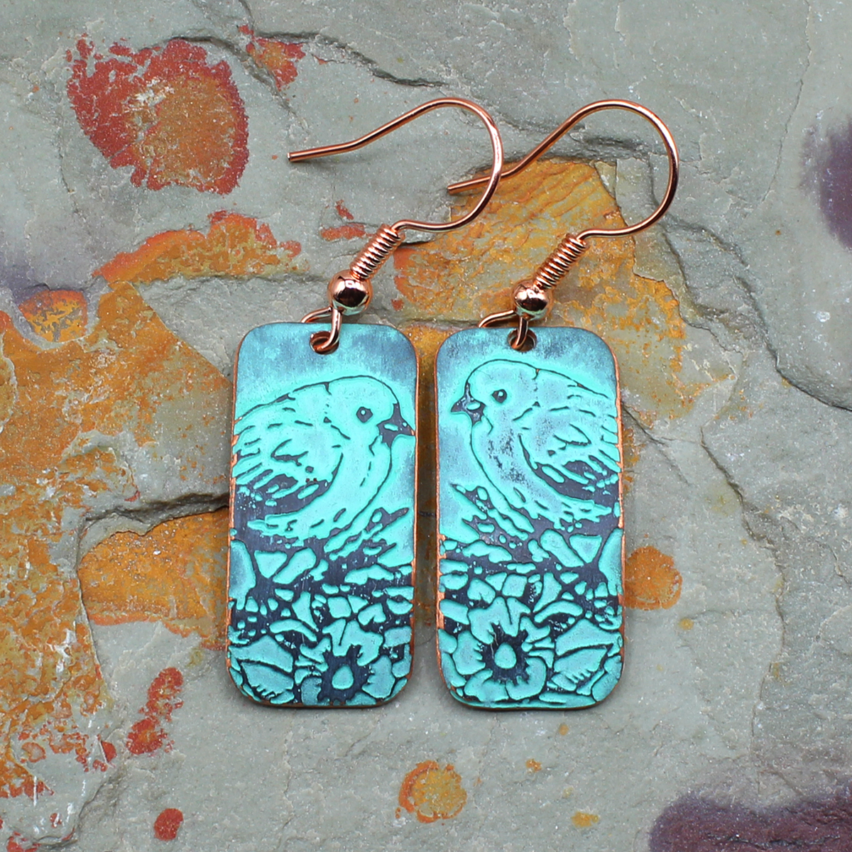 Made by hand, I use an acid etching process to create the design directly in the copper. The dark and turquoise patinas give the metal a weathered, lived-in look that fits the nature theme. Each pair is one of a kind and easy to wear with just about anything.