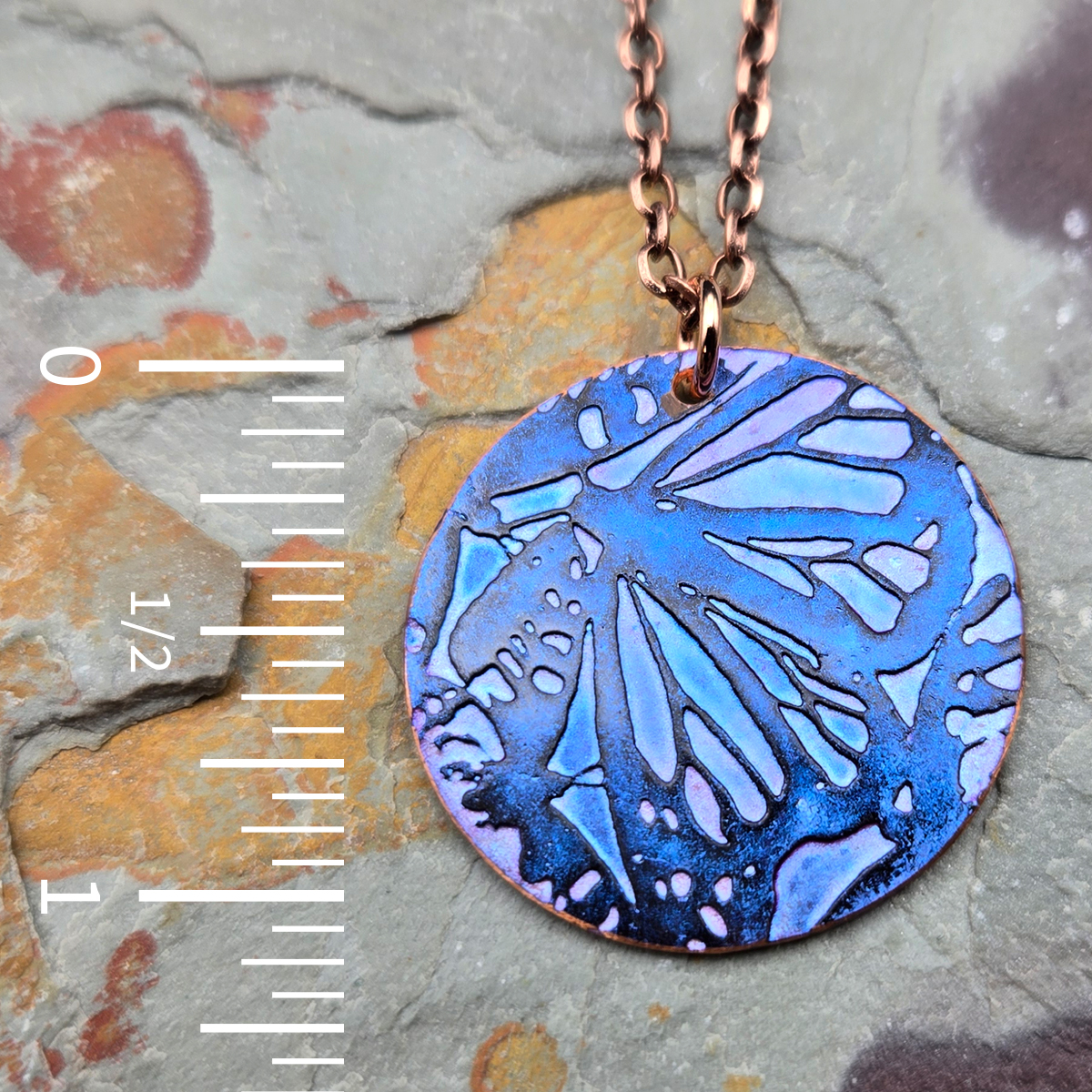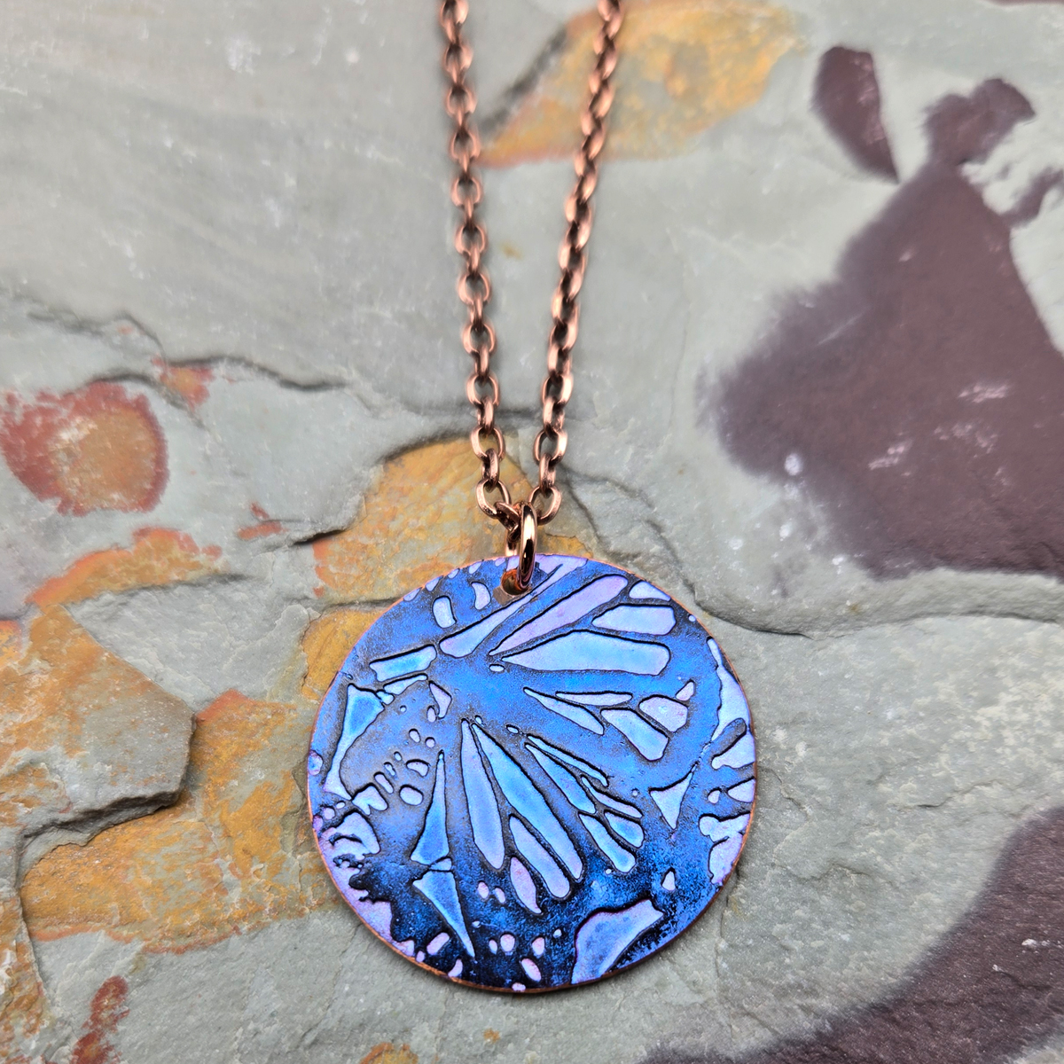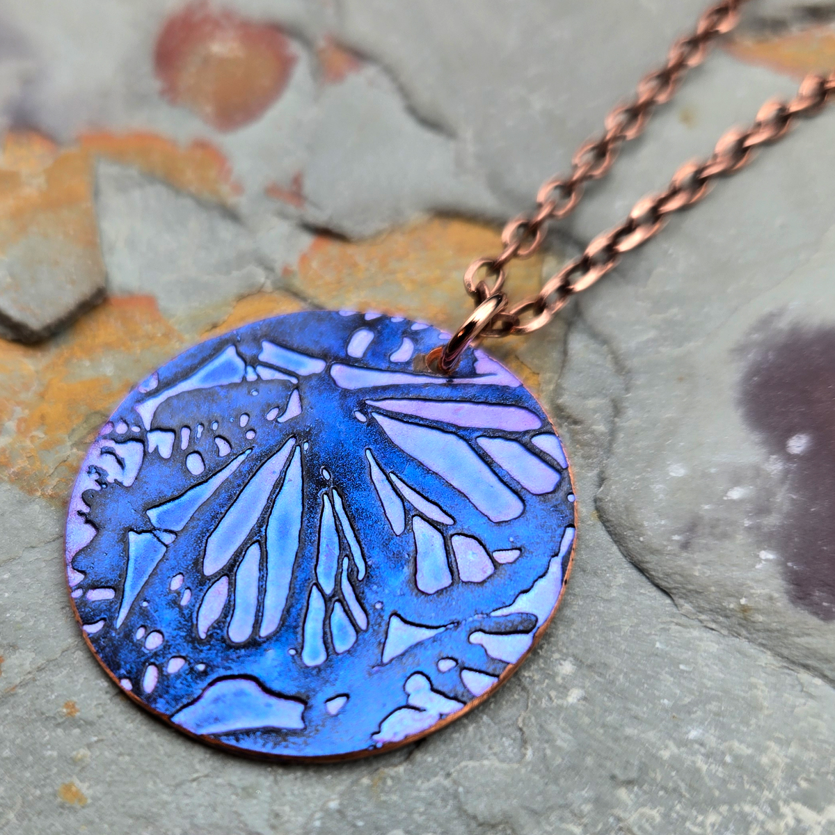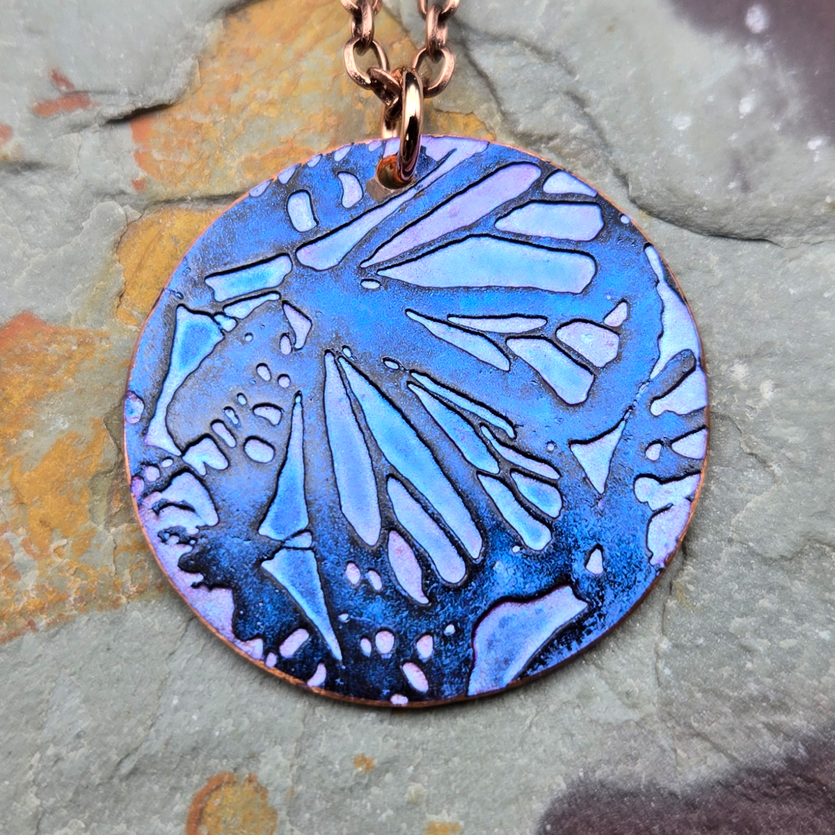 I finish the butterflies with my purple-flash iridescent patina, which shifts from purple to blue depending on the light. I apply a metal sealer to the front of the medallion to protect the colors. The back will develop a natural patina over time, adding even more character to each piece.