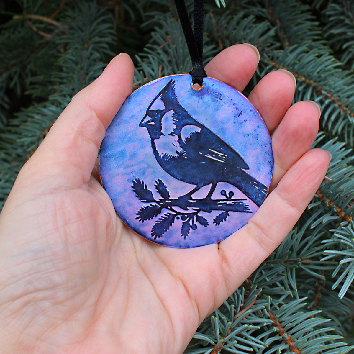 I create these 2.5 inch copper rounds with a simple goal in mind. I want them to feel warm, personal, and a little nostalgic. The cardinal is a symbol of connection. It is often said that a cardinal shows up when someone you love is near. This ornament is perfect for someone keeping a loved one close in spirit, or for anyone who values a peaceful holiday touch.
