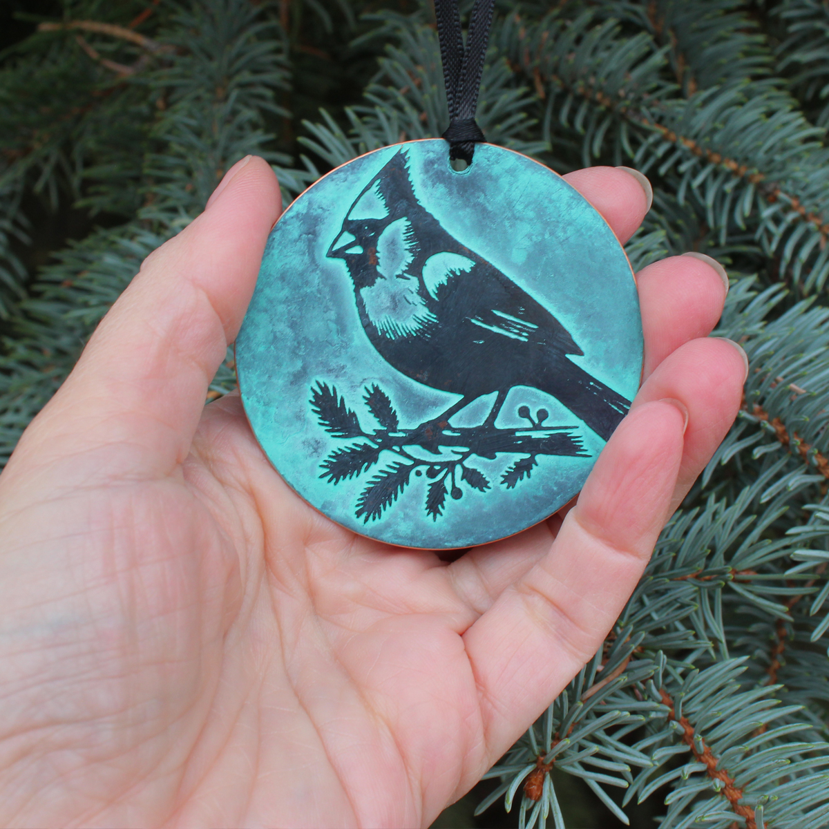 I create these 2.5 inch copper rounds with a simple goal in mind. I want them to feel warm, personal, and a little nostalgic. The cardinal is a symbol of connection. It is often said that a cardinal shows up when someone you love is near. This ornament is perfect for someone keeping a loved one close in spirit, or for anyone who values a peaceful holiday touch.