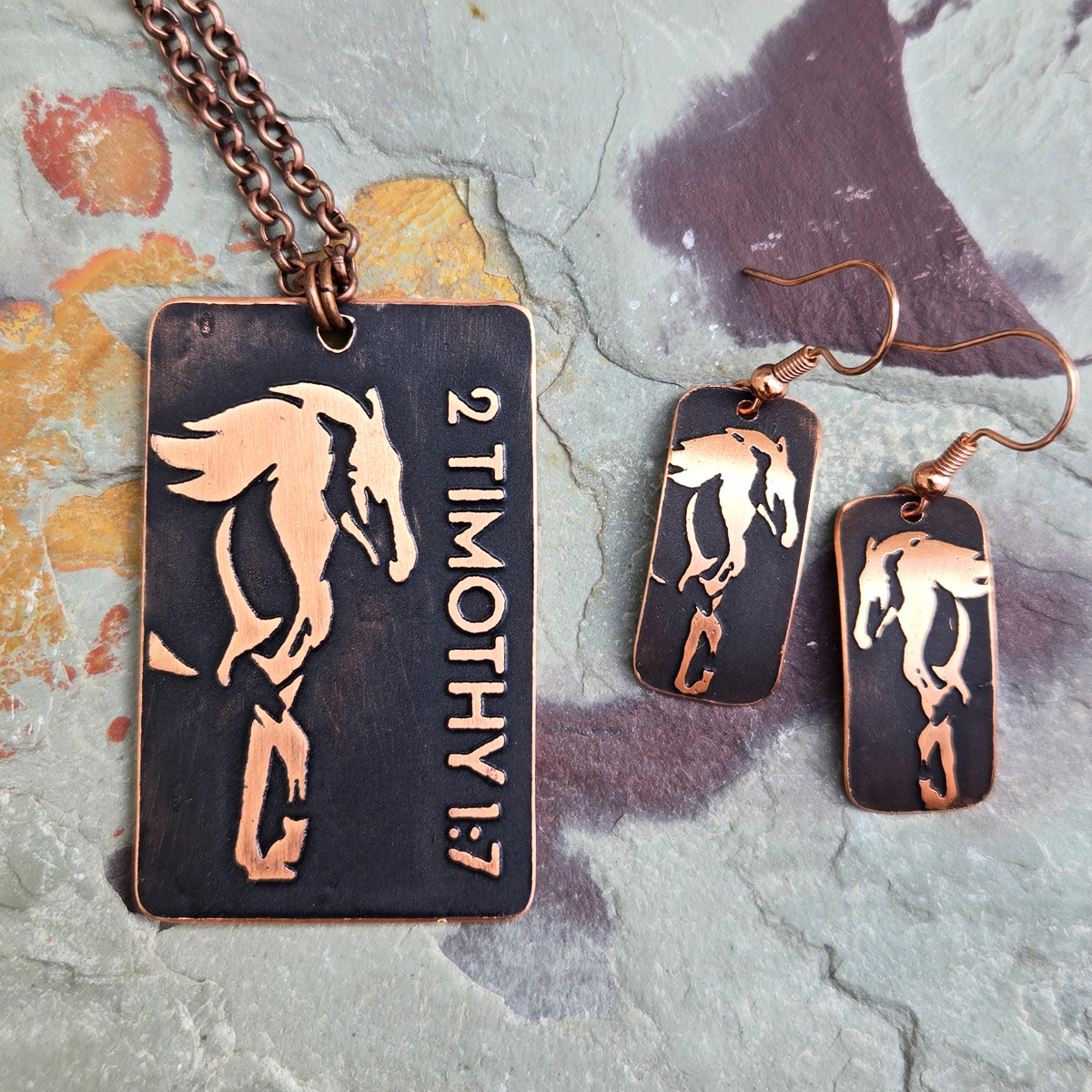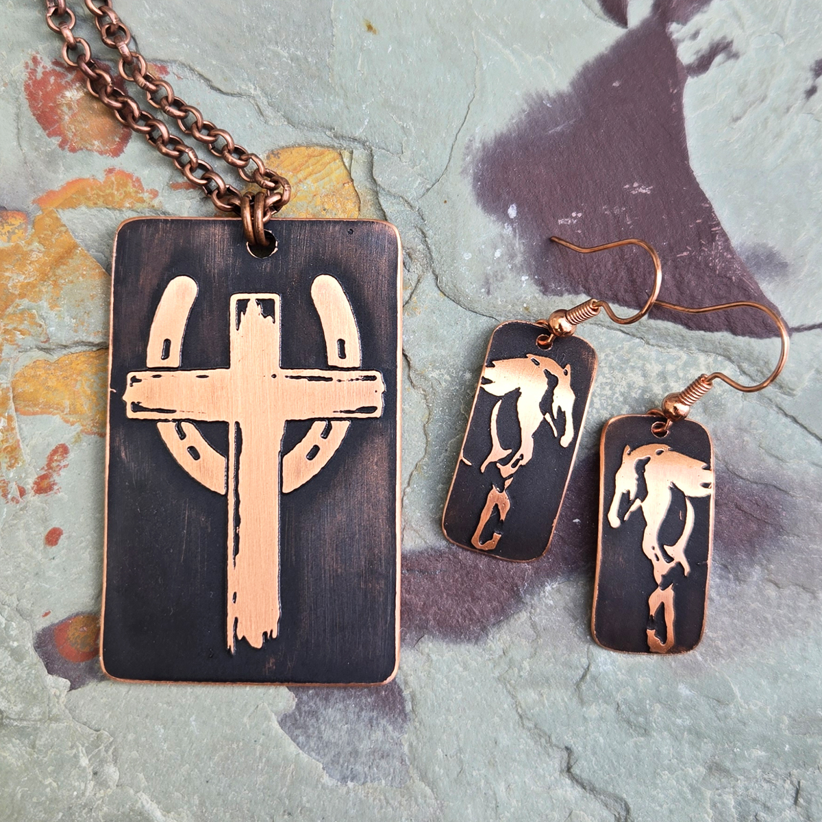 Custom double-sided necklace created for Traci Clemons. One side features a cross and horseshoe, reflecting faith, protection, and a deep connection to the horse. The reverse side shows a horse paired with a meaningful Bible verse. The necklace measures 30 inches and adjusts up to 33 inches. Matching horse earrings complement the necklace and are included in the package price. I hope you love them, Traci.