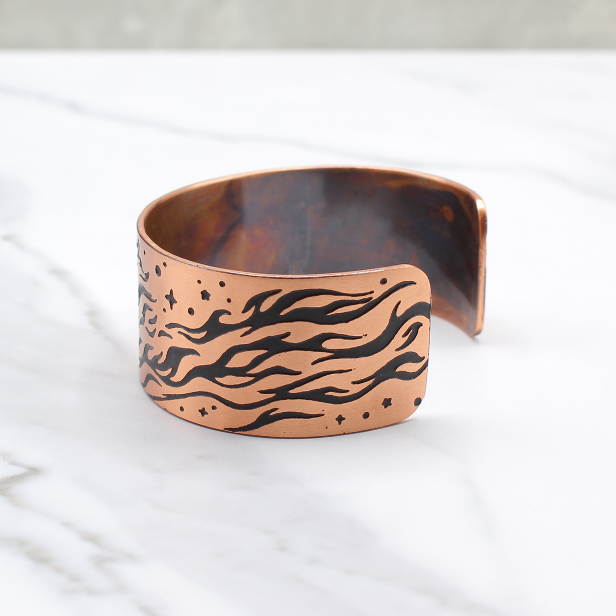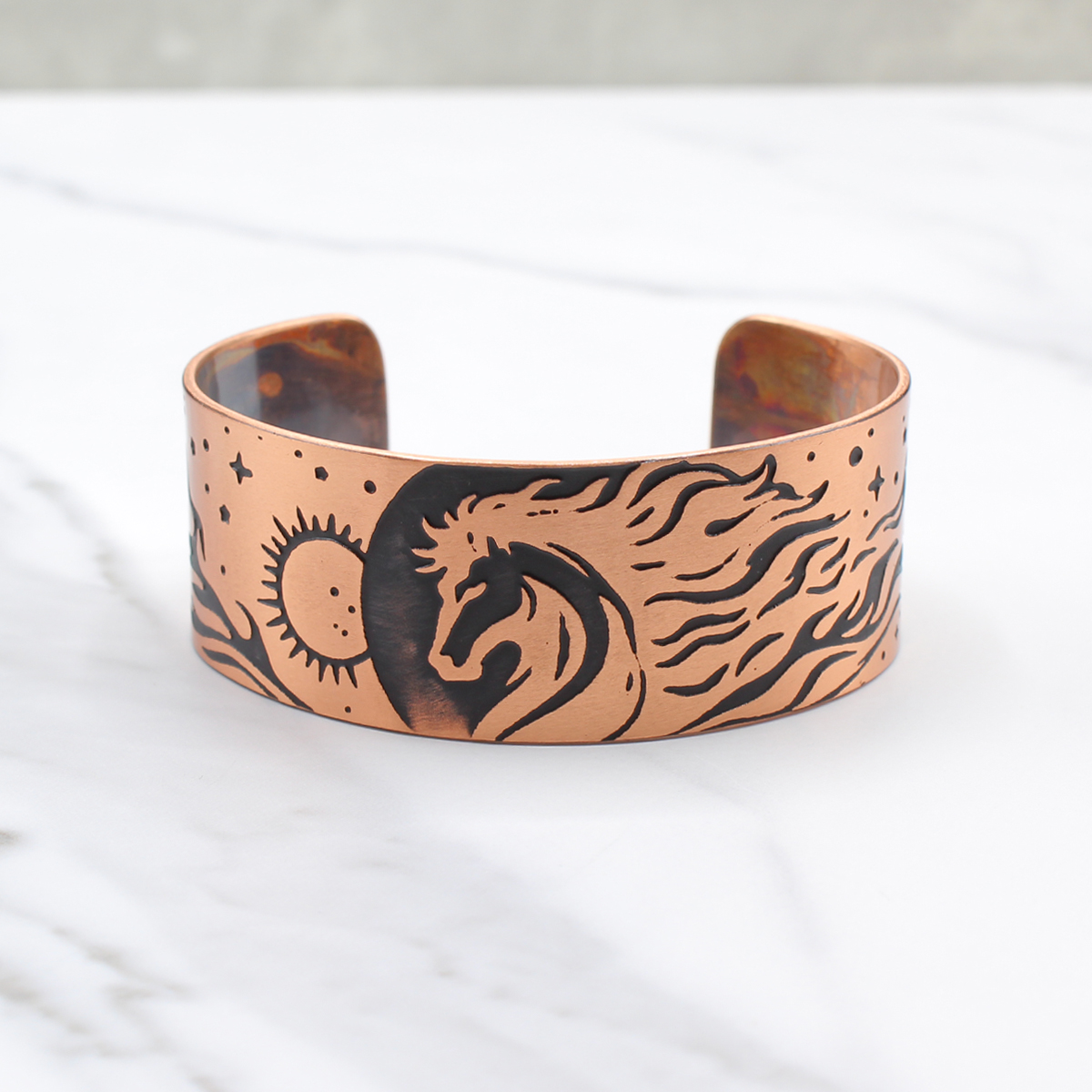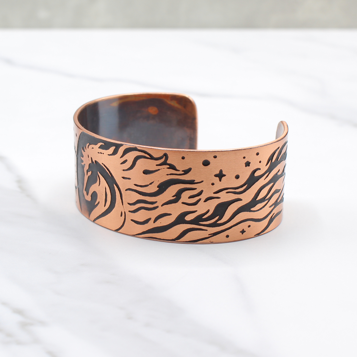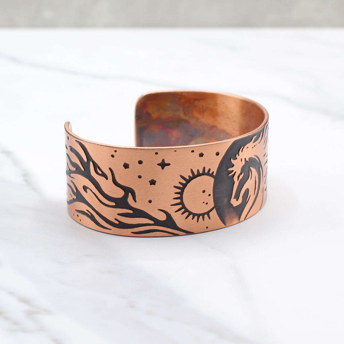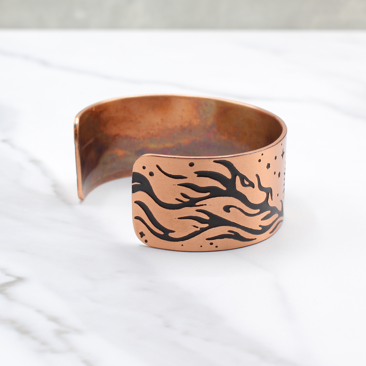 The dark patina settles into the acid-etched Fire Horse design, bringing out the movement in the flames and the forward motion of the horse. The exposed copper catches the light and adds warmth to the piece. I seal the bracelet with a protective coating to help prevent it from tarnishing.